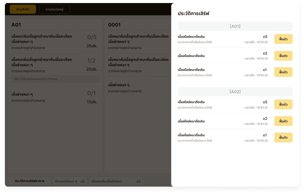 ครัวสามารถบันทึกสถานะการเสิร์ฟอาหารแบบเรียลไทม์และคุณสามารถตรวจสอบอาหารที่เสร็จแล้วได้ทันที ช่วยรับประกันความตรงต่อเวลาในการบริการในช่วงเวลาที่มีลูกค้าจำนวนมาก