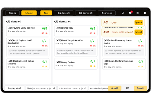 Mutfak ana ekranı, tüm sipariş bilgilerini gerçek zamanlı olarak günceller ve şeflerin her yemeğin hazırlık durumunu doğru bir şekilde takip etmelerini sağlar.
