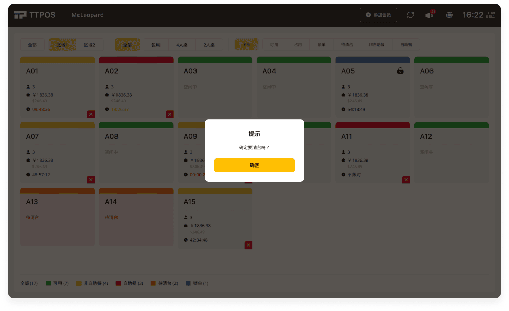 当顾客用餐结束,点餐助手提供清台功能,服务员只需一键操作即可将桌台状态设置为可用,并清除订单记录,为下一个顾客腾出空间。